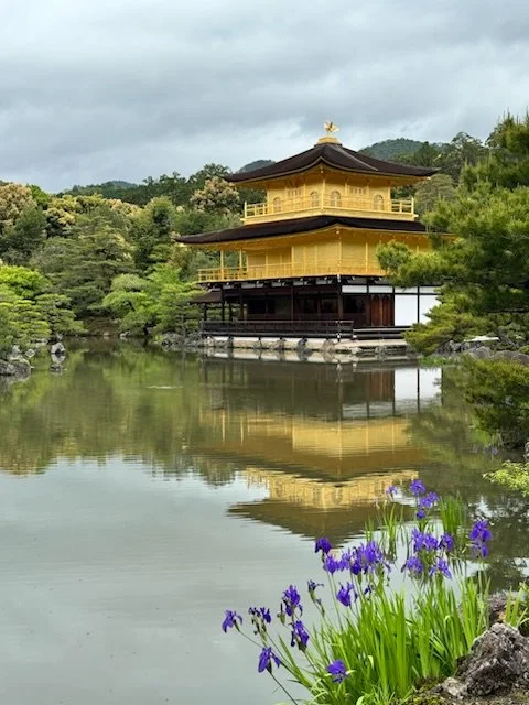 We visited the Golden Pavilion built in 1399 as a private house, later becoming a Zen Temple and using real gold leaf for the two upper stories which shine across the lake framed by deep purple irises.